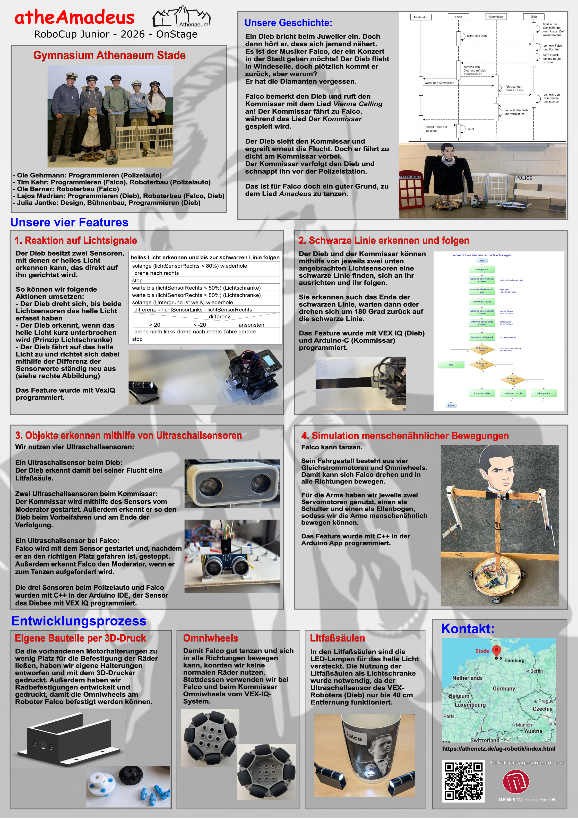 Die geplante Teilnahme des Teams "atheAmadeus" mit ihrer Falco-Show an der EM in Wien ist also unmöglich, weil sich das Team jetzt für die Weltmeisterschaft qualifiziert hat. Die WM findet vom 30. Juni bis zum 6. Juli in Incheon in Südkorea statt. https://2026.robocup.org Wer das Team "atheAmadeus" beim Projekt Weltmeisterschaft in Südkorea unterstützen möchte, meldet sich bitte bei thomas.allion@athenetz.de . |